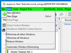 * "''New Window''"<br>Opens a new expecco window. Initially, this will show the same suite. However, it is possible to edit another suite in there, by [[FileMenu | opening a suite there]]. |