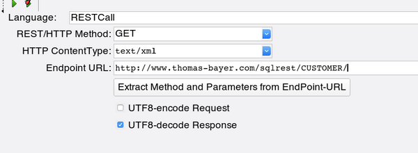 These blocks define a remote procedure call via the REST protocol. REST blocks are created in the navigation tree via the "New Action"-"Services"-"REST Action" menu item. They are to be configured with a service endpoint (i.e. URL) and a sub-path to address/identify the object under that endpoint.