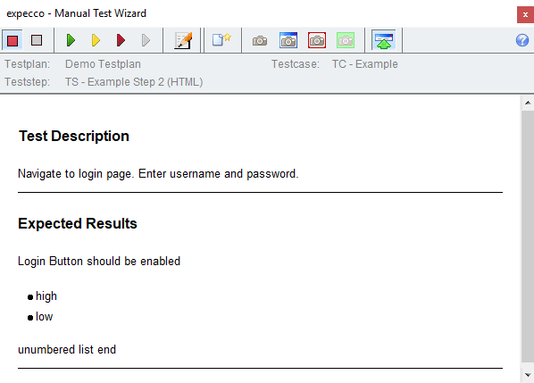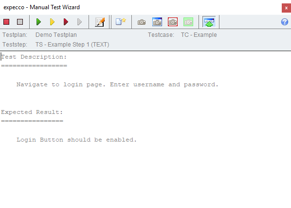 Die Symbolleiste enthält alle Funktionen, um den Testschrittstatus zu definieren, einen Kommentar zu dem jeweiligen Schritt zu editieren, Datendateien und / oder Screenshot-Bilder anzuhängen.