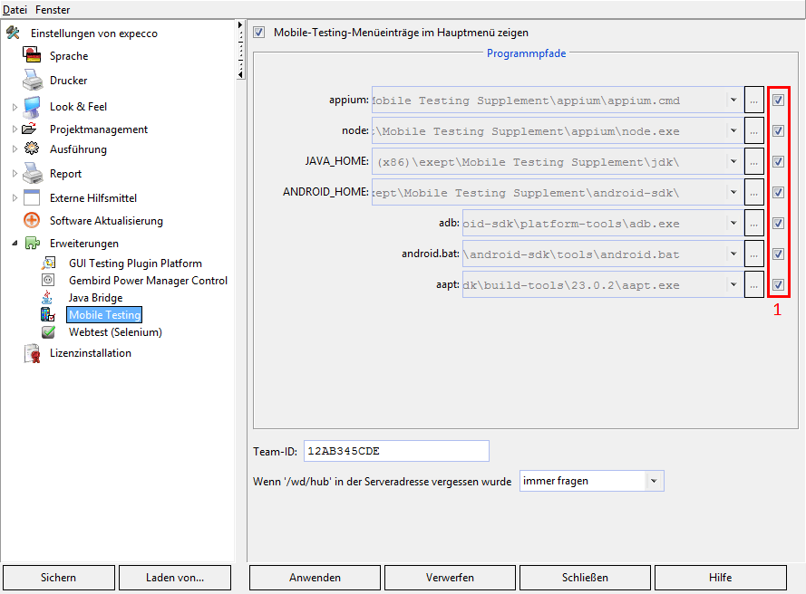 Bevor Sie loslegen sollten Sie die Einstellungen des Mobile Testing Plugins überprüfen und ggf. anpassen. Öffnen Sie im Menü den Punkt Extras > Einstellungen und dort unter Erweiterungen den Eintrag Mobile Testing (Abb. 1) Zu Beginn ist für sämtliche Pfade eingestellt, dass expecco diese automatisch setzt (1). Um einen anderen Pfad einzutragen, schalten Sie diese Option ab.