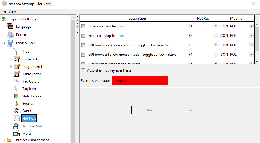 If you want to start the hotkey service directly after the expecco startup, please enable the check box "Auto start hot key event listener". If you want to start the hotkey service manually press the "Start" button. If the "Start" button is disabled you may have unapplied changes in the settings. Please apply them first. After that the "Start" button should be enabled and ready for starting the service.