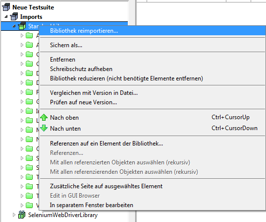 Wenn Sie eine vorhandene Testsuite laden, werden auch die Bibliotheken geldae, die in der Suite verwendet werden. Bibliotheen sind ein Teil einer Testsuite. Um eine Bibliothek zu aktualisieren müssen Sie sie "Reimportieren".