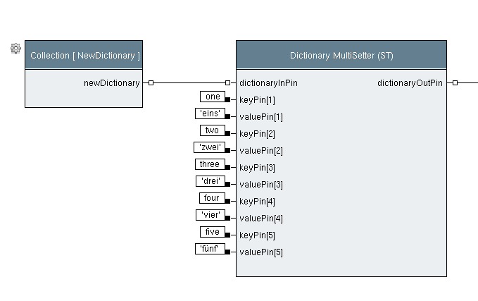 The following defines a block to set multiple key-value associations in a dictionary object. In the schema, the last two input pins were defined as a variable-pin-group (using the second to last pin's "special attribute" menu). Therefore, the last two pins can be replicated an arbitrary number of times in a step. The block's elementary code must of course be prepared for this, and loop over the step's number of input pin values. The block's definition is: