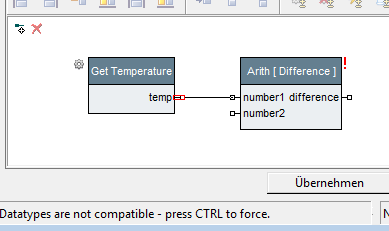 but wait, the connection is not allowed, because the "Any"-output is more general than the "Number" input pin. ANd expecco gives a warning message in its info-line at the bottom.