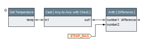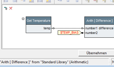 Now assume that you need to further process the temperature value; for example, subtract a bias-temperature. An obvious choice is to use a "Subtract" block from the standard library, which is defined as: