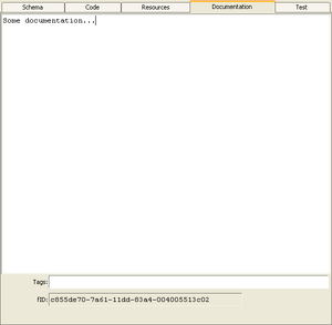 For any non-documentation tree element (i.e. especially action block definitions), the item's functional ID and version ID of the element are shown (read only) and an input field allows for a set of tags to be given to the element.