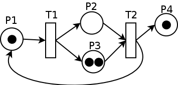 A Petri Net (see Wikipedia) is a network consisting of places (with possible action processing) and transitions. In a classical petri net, anonymous tokens travel along connections and transitions control the firing (triggering) of following action steps depending on the arrival of tokens at their input side, and passing tokens to their output side.
