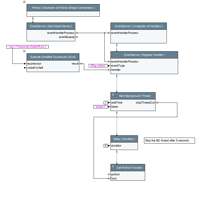 The expecco API provides functions and access to the underlying class library for the use in elementary blocks written in Smalltalk and JavaScript (i.e. for code which is executed inside expecco itself). This API is not available for elementary blocks written in other languages which are executed by external script engines (Shell, Batch, Python, Node.js etc.) or inside a different Java or CLR Virtual Machine (Groovy, VBScript, IronPython). However, a subset of the functions are supported as RPC (remote procedure calls) in bridged elementary actions.