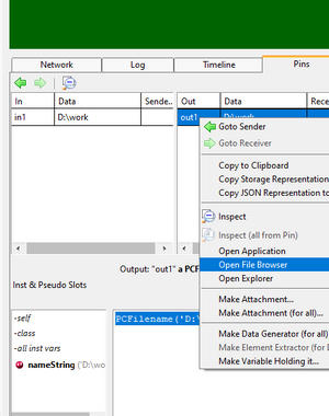 If an input/output pin's value represents a filename, the pop up menu also provides this function.