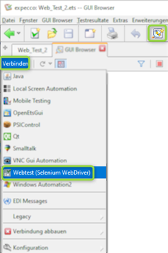 Klicken Sie dafür oben links im GUI-Browser Tab auf "Verbinden" und wählen Sie die entsprechende UI Technologie aus.