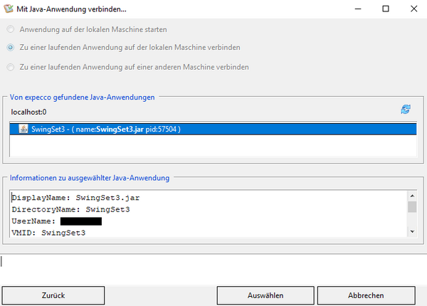 Ermöglicht die Verbindung zu lokal laufenden Java Anwendungen. Der Java-Agent wird automatisch mit der Java-Version, die Sie in den Expecco Einstellungen festgelegt haben, gestartet.