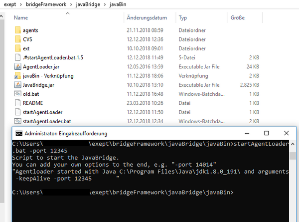 Um eine Verbindung remote zu erstellen, muss zunächst auf dem Zielrechner der Java-Agent gestartet werden. Dazu navigieren Sie auf dem Rechner zum zuvor kopierten Verzeichnis ...\packages\exept\bridgeFramework\javaBridge\javaBin. Dort liegt ein Skript, welches automatisch die Java-Version in JAVA_HOME erkennt und den korrekten Agenten startet.