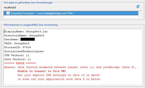 JAVA VERSION MISMATCH Wie im Bild zu sehen, kann es zu Java Versionskonflikten zwischen dem Agenten und der Anwendung kommen. In diesem Fall ist es am einfachsten die Expecco Einstellungen für Java Bridge anzupassen. Eine Remote Verbindung müsste das Programm stattdessen manuell mit der gewollten Java Version starten. Der Java Agent, wenn über das startAgentLoader skript aufgerufen, wählt die Version Anhand von JAVA_HOME auf dem remote System
