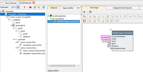 Falls eine Anwendung mehrere Java-Technologien verwendet, müssen Sie nur eine Verbindung aufbauen und dann die Bausteine aus der Bibliothek entsprechend der Technologie des anzusprechenden Elements verwenden. Seit expecco 21.1 können Sie alternativ Bausteine aus der CommonJavaGUILibrary verwenden. Lesen Sie mehr zu den verschiedenen Bibliotheken im nächsten Abschnitt.