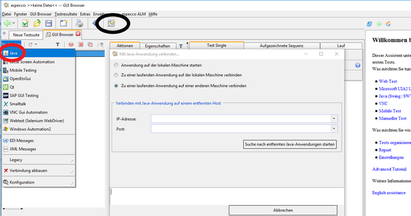 Zunächst wählt man über den GUI Browser (schwarzer Kreis) im Reiter Verbinden die Option Java (roter Kreis) aus. Im sich öffnenden Dialog kann man nun zwischen 3 Optionen wählen.