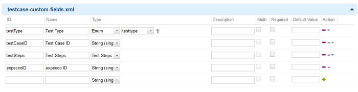 Für den Testrun müssen zwei neue Customfields angelegt werden. Ein Feld mit der ID expeccoRun und der soeben erzeugten Enumeration als Typ, ein weiteres Feld mit der ID runningHost vom Typ String. Letzteres Feld wird später von einem expecco-Host benutzt, wenn dieser den Testlauf bearbeitet.