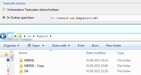 kann unter Testsuite sichern ein neuer Ordner angelegt werden, in dem alle überschriebenen Testsuites gespeichert werden, ansonsten werden die tatsächlichen Testsuites überschrieben.