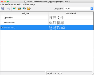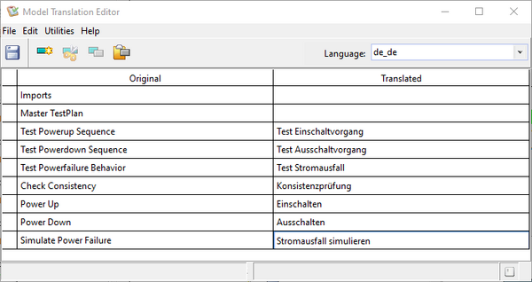 Model language translations are added, modified and possibly removed using the "Model Translation Editor", which is opened via the "Extras" → "Translation (Model Language)" menu item.