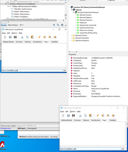 Graphical VisualWorks ("VW") applications do not use "proper" windows to represent widgets such as buttons, input fields etc. All widgets are drawn into a single top-level view. Thus, most UI automation and testing tools will not be able to automate VisualWorks applications on a logical widget level. Instead, they see a single window, and you have to navigate to widgets by position/offset or image detection mechanisms. They are also no be able to extract attributes (such as selection index, text contents, enabled state etc.), and you have to use mechanisms like bitmap image comparison to find elements and OCR (optical character recognition) to extract semantic data (text contents) from the VW user interface.
