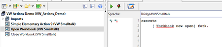 The VW-action will be executed inside your VW image. Thus, these blocks allow you to open additional windows, to interact with custom interfaces, custom widgets or to start background processes inside VisualWorks. It is also possible to interact with model objects, as long as you provide some accessors as class methods (of course, as an experienced Smalltalker, you can get any object eg. with "someClass allInstances do:[...]"; however it is less obscure, if you use concrete getter methods).