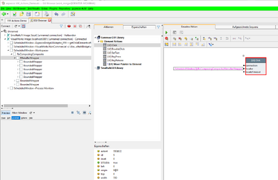 When connected, the usual widget tree is shown; when selected, a widget's attributes are shown in the middle pane, and actions can be selected from the action list and recorded or executed and tested individually:
