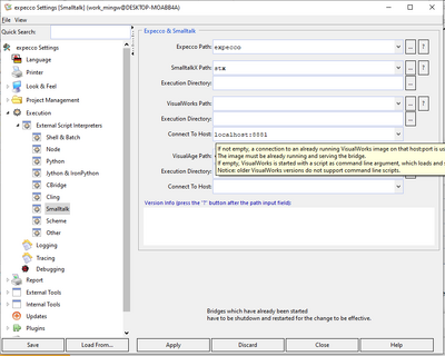 In expecco, you have to configure the connection (in "Extras" - "Settings" - "Execution" - "External Script Interpreters" - "Smalltalk") as: